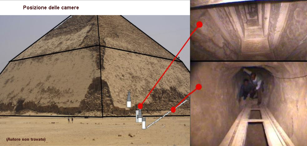 Secondo altri studiosi la riduzione dell’angolo si rese necessaria per diminuire il peso che gravava sulle camere sottostanti dove pare vennero rilevate delle crepe. Sinceramente non credo che, alle prime avvisaglie di crepe che compromettevano la stabilità dell’opera, si sia deciso di proseguire nella costruzione riducendo solo un po il peso, (ma è un’opinione del tutto personale e da profano).