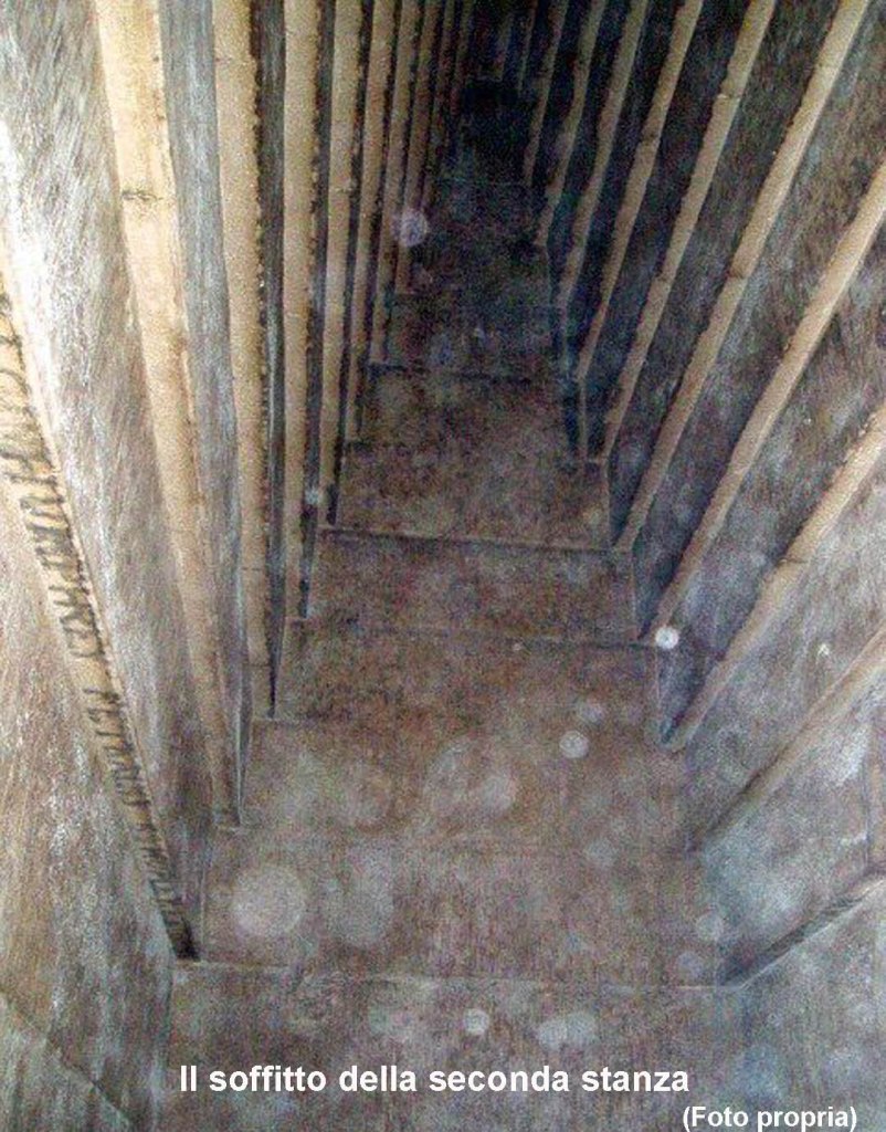Il soffitto della seconda camera il cui centro geometrico coincide con il centro della base della piramide, è costituito da una splendida volta aggettante.