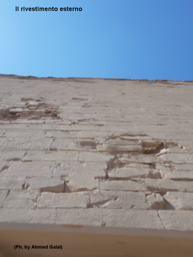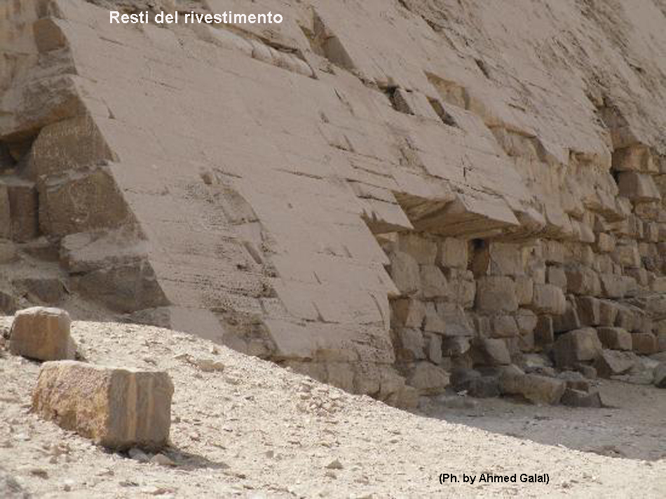 Il rivestimento esterno della piramide satellite è fatto con piccoli blocchi di calcare molti dei quali recano ancora sia il nome di Snefru sia il grafema “hw”, l’antico nome della piramide.