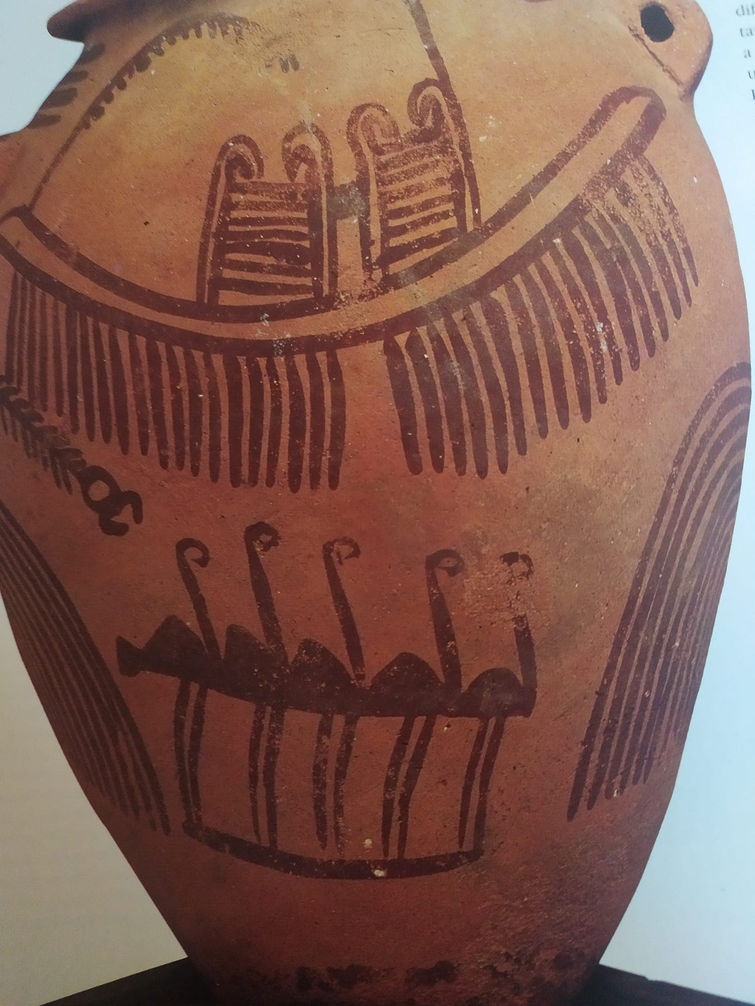 Il vasellame prodotto durante questo periodo si distingue per l’uso di terracotta chiara, forse già lavorata con ruota a mano, lasciata del colore naturale e decorata con motivi stilizzati dipinti di rosso che riproducono animali, vegetali, uomini e imbarcazioni.